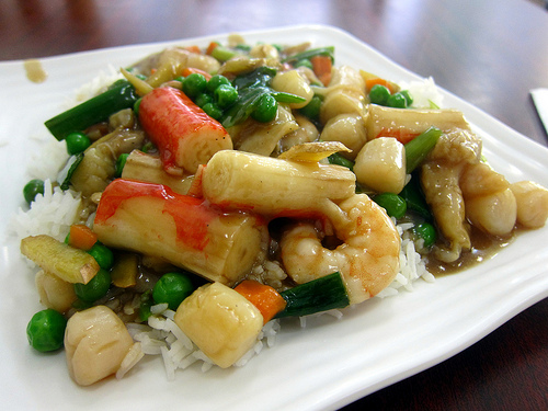 I had not read any reviews so I just picked an item willy-nilly from the laminated menu. I ended up getting the seafood combo over rice. You can order any of the meals as entrees if you’re there with a bigger group.