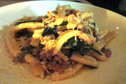 My friend and I decided to order one pasta each and share rather than entrees. I chose the casareci, a sausage pasta. Casareci is a slightly curled shape and held the sauce and cheese very well. I loved the dandelion greens in this dish.