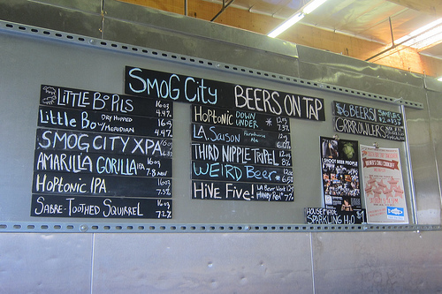 Following the disastrous Ramen Yokocho Festival and a quick bowl at Umenoya Ramen, we headed over to Smog City Brewing Company for beer. Torrance is rapidly becoming a haven for craft beer breweries. Smog City Brewing’s unassuming taproom is located in a nondescript industrial park.