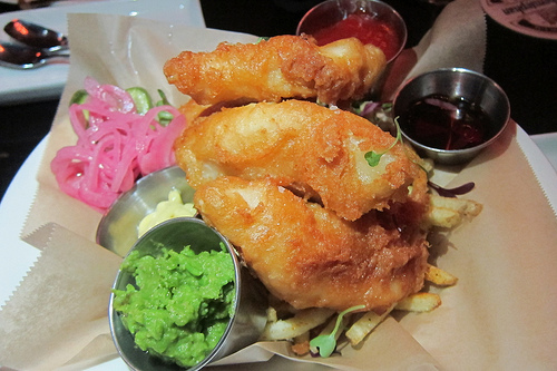 I actually quite enjoy the mushy peas and thought the pickled onions were a nice touch to lighten up the dish. Of course I couldn’t resist dipping my fries and fish into the malt vinegar. I also created a sort of Thousand Island dressing by combining ketchup with malt aioli. I suppose you could also dip the fries into the mushy peas as well. It’s good to have choices.