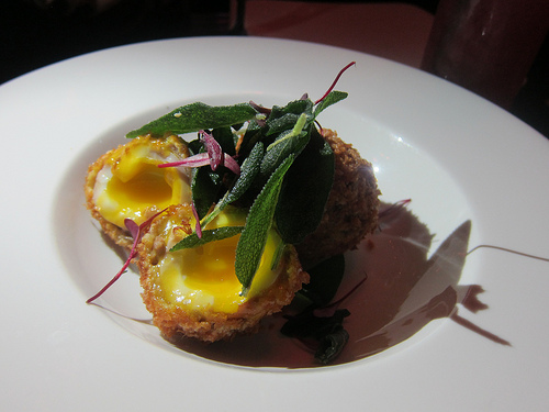 Speaking of rich egg yolks, the Scotch egg at the Morrison is cooked just right with the yolk spinning out of the perfectly fried sausage wrapped egg.