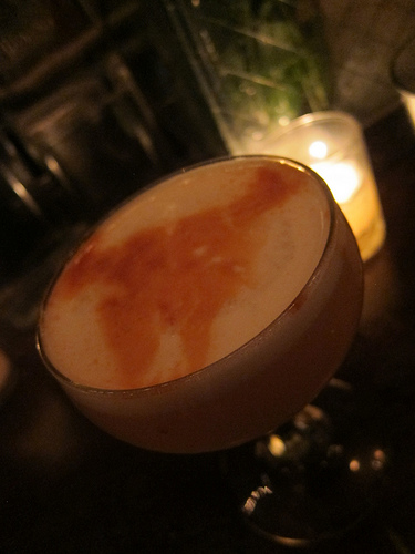 When I first heard of the name of this drink, I thought head barman Dave Kupchinsky said “Bulls on Parade” which made sense because of the stenciled skeletal steer head. However, it’s actually Bols on Parade, a reference to the brand of genever in the drink. It’s a lovely and delicate drink with a tough edge– and not because of the dead cow head. The sherry is what keeps this drink from being too summery. It’s a nice way to start your (not-so-chilly) evening.