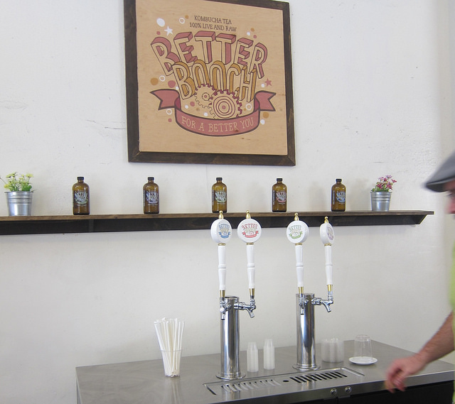 I may be a native Angeleno but I don’t usually fanatically follow the “healthy” food trends. Unless it’s kale. I’m all about kale. In any case, I never tried kombucha (fermented tea drink) because there’s a certain yoga pants wearing stigma attached to it. I recently did try Better Booch, the kombucha seller at Grand Central Market. I was pleasantly surprised. It tasted like a shrub (sweetened vinegar based syrup). And I’m all about shrubs… in cocktails. How about kombucha in cocktails? Oh, it’s been done? Not by The Minty it hasn’t. Coming soon to LA Cocktails, “healthy” booze recipes. In the meantime, try the Original Gangster at Better Booch. I also liked the Apple Ginger Rogers.