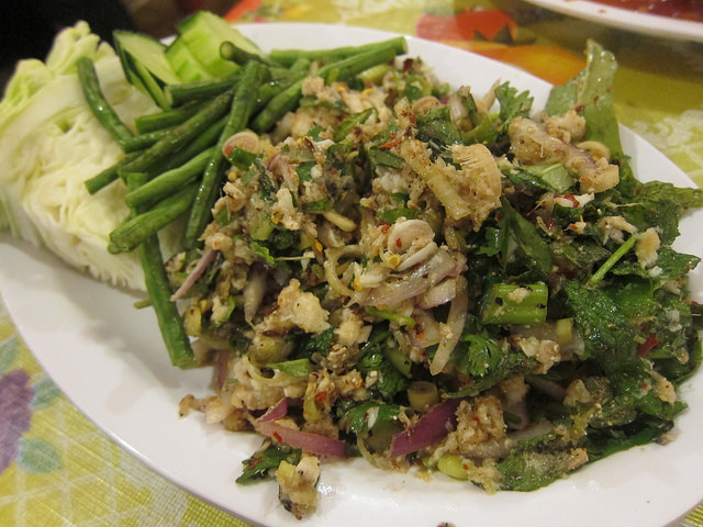 I know I shouldn’t love catfish as much as I do. The fish is considered dirty by some but it’s wonderful fried and as part of this catfish larb. Although the cabbage is meant to be eaten in between bites to take away the spice, I made mini “tacos” with the larb and cabbage leaves.