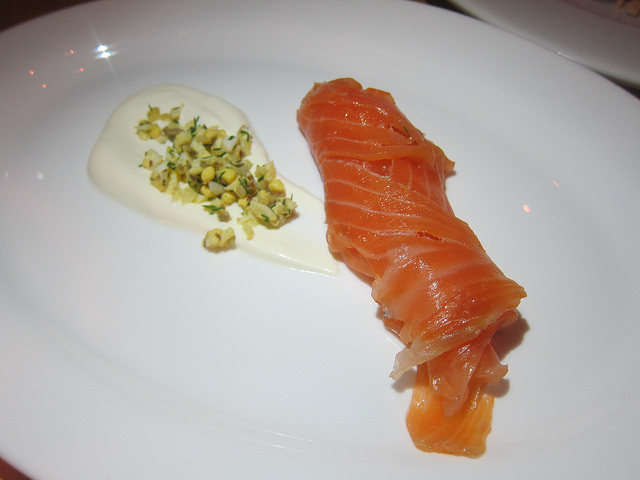 I love aquavit. I don’t see it enough in mixed drinks and haven’t developed a healthy fear of it yet. I liked the idea of using aquavit to cure the Scottish salmon. I’ve had gin, tequila and vodka cured salmons before so why not aquavit? The fish retained a nice snap and went well with the creme fraiche and chopped egg salad.