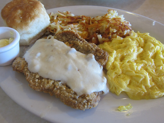 I can’t resist country fried steak so I got that smothered in country gravy along with hash browns and softly scrambled eggs. Everything was perfect.