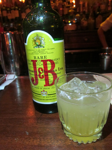 We began the evening with Gold Rush drinks made with J & B Scotch from 1941. Considering there are some people out there who don’t even want you to put ice in your whiskey, they might be horrified by this drink. I was rather pleased with it as occasionally I find Gold Rushes to be too sweet. This one made by the incomparable Zahra Bates, was perfect. The bright citrus worked well with the mellow, aged Scotch.