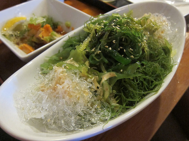 We knew we would get quite a bit of cooked stuff but couldn’t resist adding a few appetizers to start. My friend suggested the seaweed salad and ankimo; monkfish liver. The seaweed salad turned out to be huge. It’s not overly dressed and a bite here and there clears the palate.