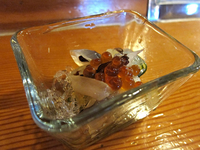 Next we had crunchy jelly fish and wonderfully cured salmon roe. The sushi master says its his own cure recipe. The roe remained plump, not mushy.