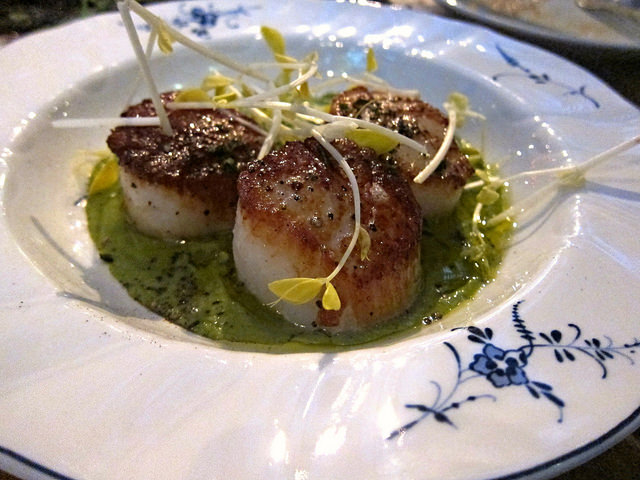 Next we had a rush of seafood starting with the scallops. At Commissary, there are 5 sauces they consider their mother sauces. There’s brown sauce (chili, soy), green sauce (garlic), red sauce (chili, garlic, onion), yellow sauce (onion, soy) and rainbow sauce (nuts, garlic, chili). The scallops are lightly seared and served with green sauce. When scallops are done right, they are always amazing. And these were done just right. I like mine just barely cooked with a nice sear.