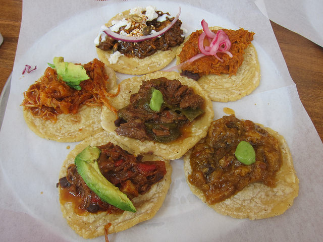 On this particular day, the sampler included steak picado, bisteca en salsa roja, tinga de pollo, (chicken) mole blanco, (pork) chicharron and cochinita pibil. So two beef, two chicken and two pork tacos. Doable, right?