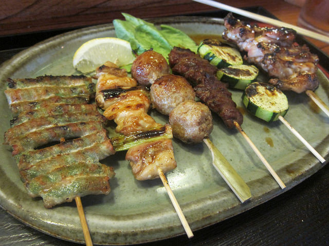 I watched the yakitori guys very carefully chop meats and skewer them on before grilling. The set comes with six skewers and it’s chef’s choice. This day, I got bacon wrapped green beans, chicken, chicken meatballs, beef, squash and chicken wings. My favorites turned out to be all the chicken items. The Japanese definitely have a way with grilled chicken on sticks!