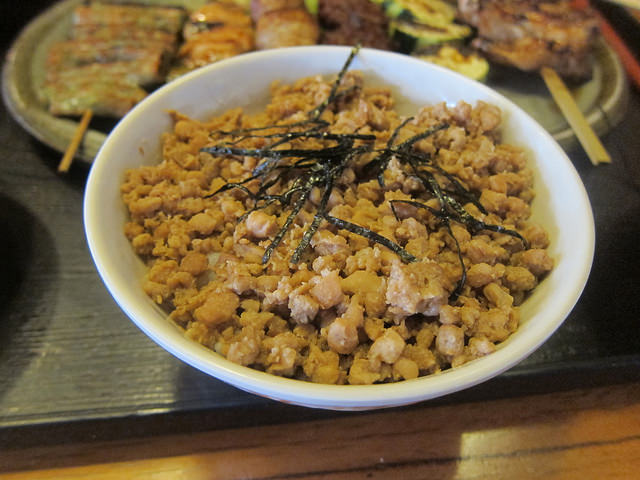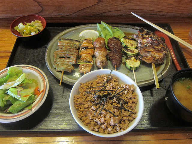 You get six skewers, soup, salad, pickles and for an extra charge, you can upgrade your plain white rice to soboro, a ground chicken rice.