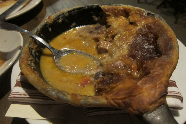 Here’s a peek inside the pie. Couldn’t Social have thickened up the sauce, gravy or whatever you wanted to call it and make it seem like a real pot pie? The carrots were barely cooked!