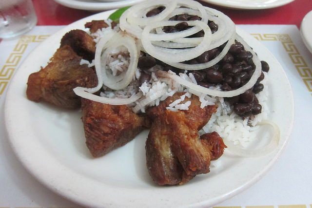 My plate of pierna de puerco frita (fried pork) was just chunks of pork but once I dressed it up with some rice, beans and onions, it became a magnificent plate. The pork was tender, flavorful and juicy. This was the best dish of the three pork dishes we tried.