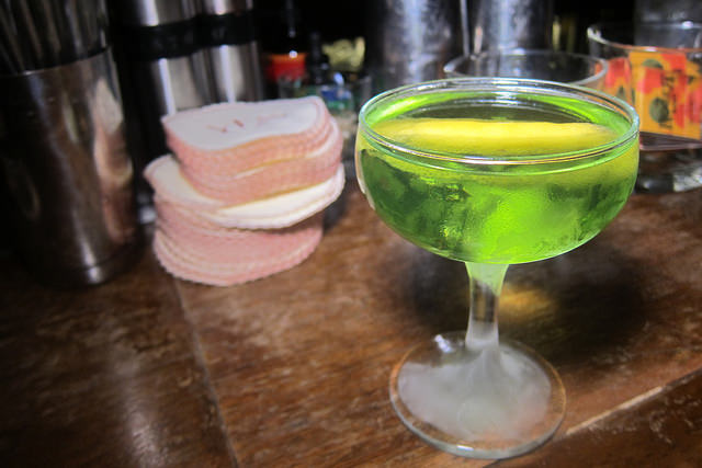 The bright green drink is the One-armed Hug. The mint bitters make it electric. We tried to guess the specs and we were slightly off but if you do try to make this at home, do it right and follow this recipe: