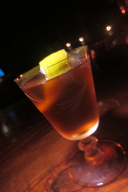 Naturally, I wanted to order Thunder right away as I’m a brown, bitter, stirred girl but restrained myself and ordered a Kinda Pina Colada, a special of the evening I went. Then I couldn’t fight my natural inclinations for a good whisky and went for it. I love Manhattan variations and this is a delightful twist with Scotch, Amaro Montenegro and really interesting vermouth and bitters.