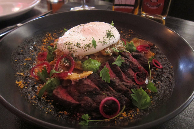 For a twist on crudo, try the ceviche amarillo. The hamachi (or yellowtail tuna) is served with squiggles of squid ink and amarillo foam. For a kick, there’s a sprinkling of sliced chili peppers as well.