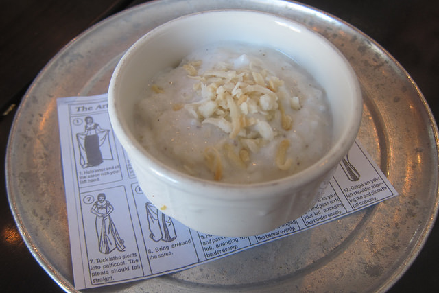 The three of us all chose the coconut milk rice pudding. I love kheer (rice pudding) and really liked that this wasn’t too sweet. You could really taste the cardamon in this dessert. The other choice are paneer cheese dumplings in sweet cream.