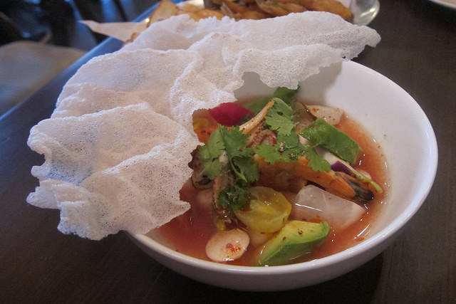 We started with the coctel mixto. Hidden under a large crispy rice paper, the delicate tomato-watermelon jus of the seafood cocktail nurtures you as you pick out a bit of shrimp or squid. I was so glad for the chunks of avocado, thinly sliced radish and a shower of cilantro. Some might want a bit of heat to this dish but I found it soothing.
