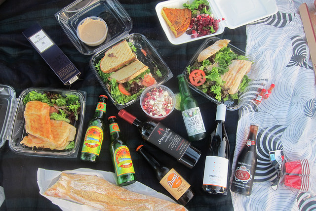 For 6 people, we grabbed three sandwiches, a nice wedge of quiche, beet salad, hummus, bread and drinks. Get your buddies to bring dessert and wine (or Scotch!) for the picnic!