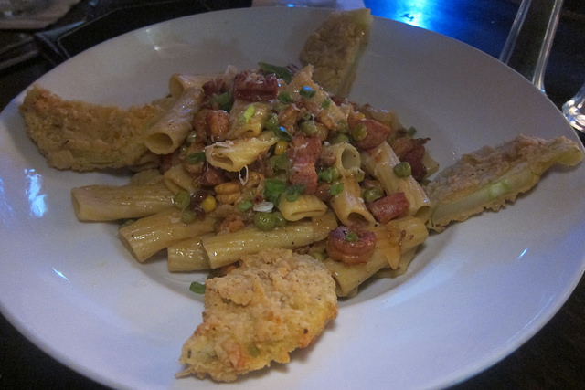 My friend decided to try a special, the andouille and crawfish pasta. The big fried pieces are not fried green tomatoes but fennel. I thought that was cool and different. She said the sausage was really good and enjoyed the bits of corn as well.