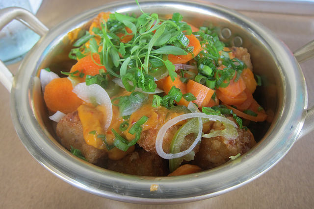 I’m one of those weird people who like vegetables AND meat. So I’m prone to order salads, side veggies and veggie-friendly dishes. The man salad is not really any of these things but get it anyway if you love tater tots? And who doesn’t when topped with kimchi flavored cheese sauce and pickled veggies? It’s really best of both worlds.