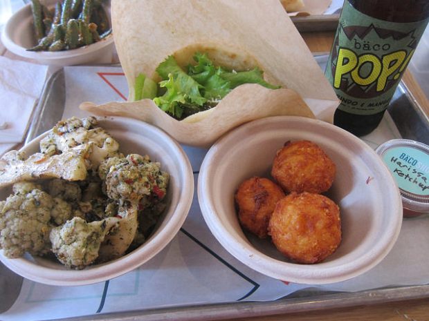 I tried the slow roasted pork baco and went to town on the sides. I chose the roasted cauliflower that was nicely spicy and had a lingering heat. I also liked the green beans which were so fresh. My favorite though was the cheddar hash browns which were little gooey bites. You can dip ’em in the provided harissa ketchup but I preferred to eat them plain. I washed everything down with a tamarind and mango Baco pop which tasted a bit like vanilla cream soda.