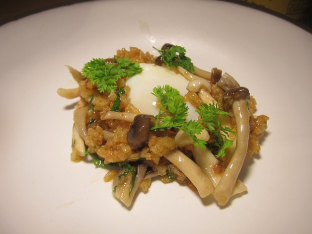 Next we had a crispy rice with mushrooms and egg. Once you mix in the soft boiled egg, the whole thing reminded me my childhood. The crispy rice made me think of my grandmother going off with the last bit of crispy rice where she always told us she gave us kids the nice soft part and we didn’t want the “hard” rice. I can see why she kept the good stuff for herself! The crispy rice was a good contrast to the soft egg and slippery mushrooms.