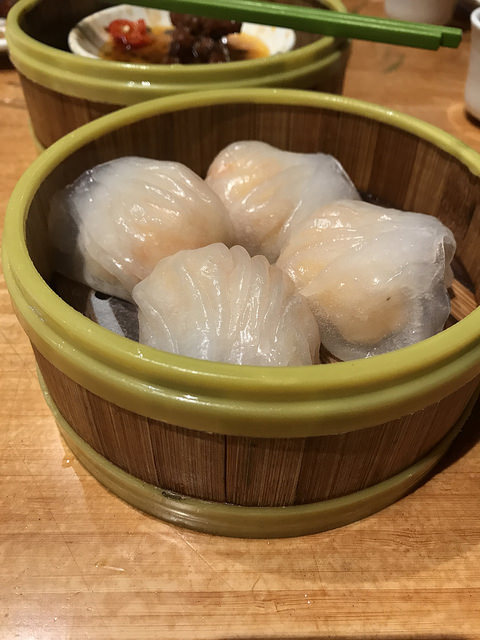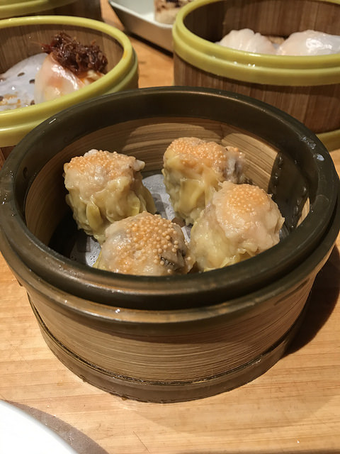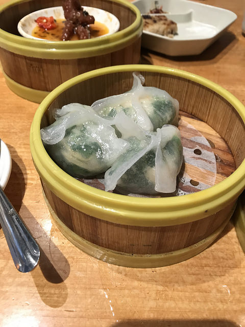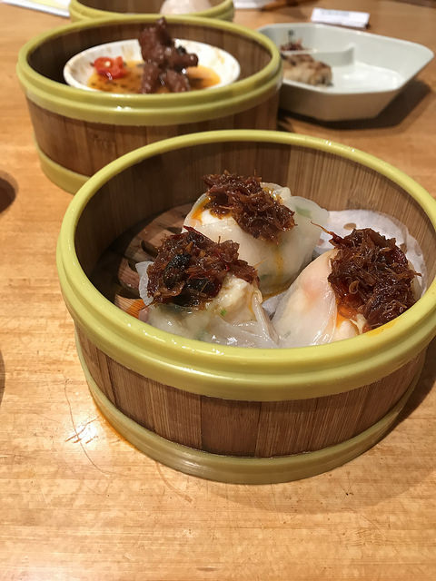 We had the usual dim sum including crystal shrimp (har gow) and the pork and shrimp dumplings known as siu mai. We added a few special dishes including abalone tarts (shown above) and dumplings doused with XO sauce. Everything was quite tasty. I loved how translucent the wrappers were to reveal the pink shrimp. Truly “crystal” shrimp.