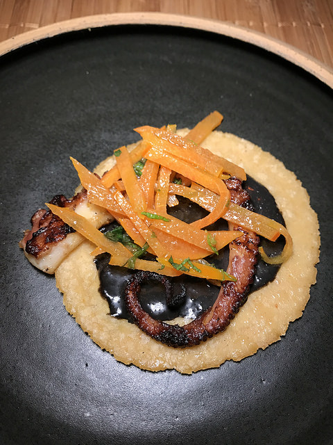 I remember the first time I had hamachi (yellowtail) and it’s still one of my favorite things to get at sushi. Here Chef John-Carlos pours hot oil and togarashi peanuts on top of the beautiful fish. I also liked the counterpoint of the citrus emulsion.