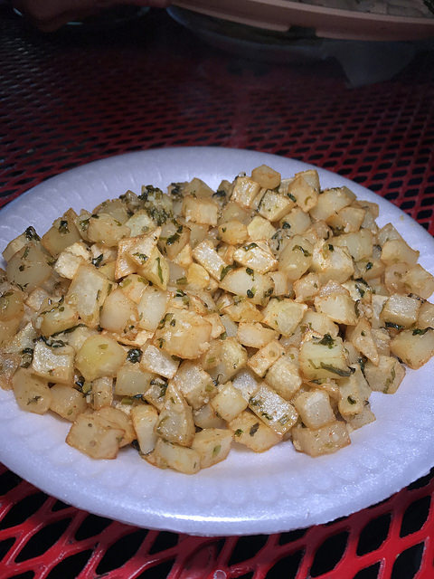 There was an intriguing and addicting spice in the potatoes. I was making myself a little package of pita, hummus, rice, meat and potatoes. Almost like a deconstructed Mexican Mediterranean (Mex-terranean) burrito. How about that as a California (San Diego) burrito then? Instead of french fries, you add these glorious cubes of potatoes.