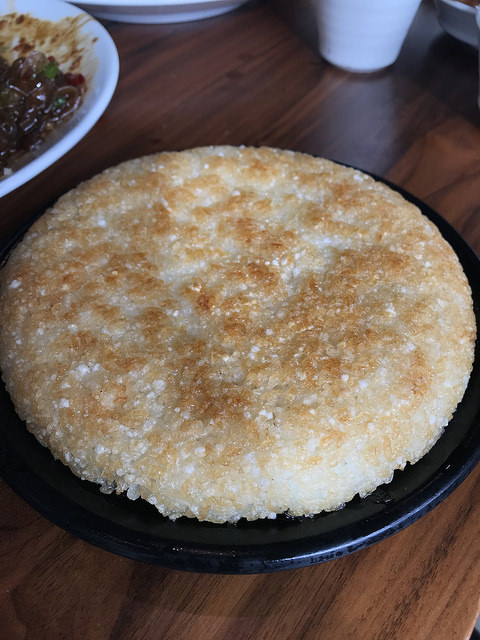 This dish is considered very healthy and you’ll see references to this all over the restaurant. Your options include getting the chicken with bones or boneless, couple or family sized, spicy or not spicy. Then you can add shredded mozzarella cheese and/or rice cakes. The stew comes with noodles and rice but I would hold off on eating that rice in favor of the scorched rice you can add in at the end of the meal.
