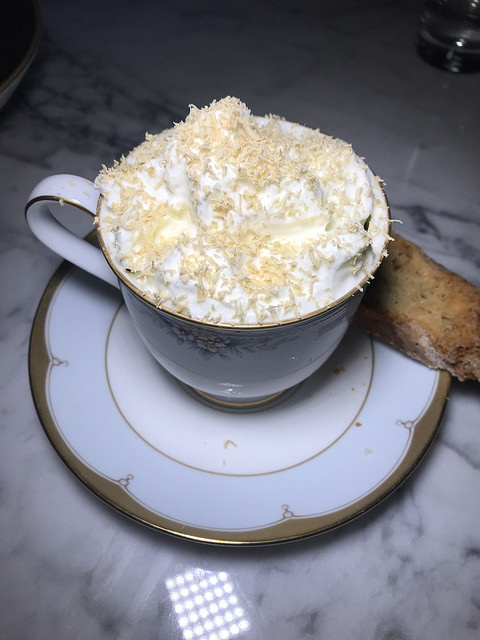 I chose the Cross of Gibraltar since I’m a big fan of Japanese whisky and sherry. I was also intrigued by the use of aquafaba, a vegan eggwhite substitute. It was very balanced and not too tart. I liked the bay leaf garnish.