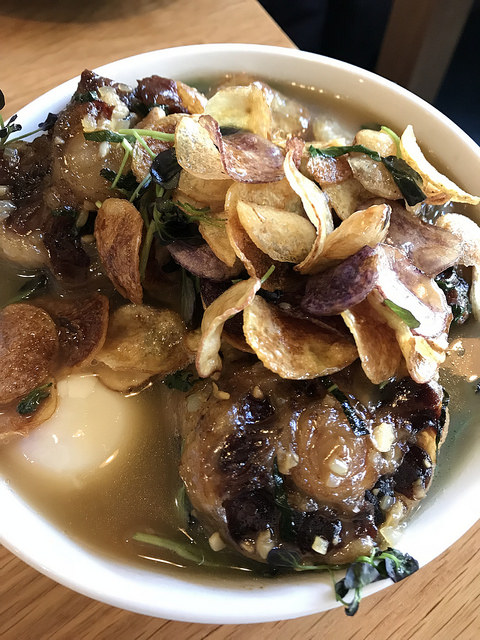 The noodles are presented with a bowl of noodles and the dish of protein of your choice from the options of top sirloin, chicken, tofu, etc. I knew right away I wanted oxtail. We also added a soft boiled egg which I promptly plopped into the lovely broth they pour over the noodles table side.
