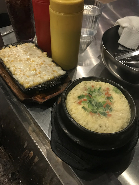 The steamed egg is good with chili and gochujang (in the yellow and red squeeze bottles. They’re not ketchup and mustard bottles here).
