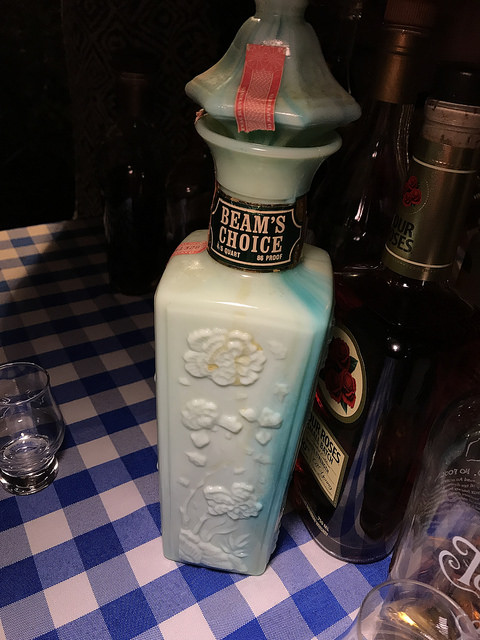 I really love looking at all the cool bottles Beam produced decades ago. Sadly a lot of the decanters contained lead so sometimes it might not be a good idea to drink any you find now. But I took the risk. [edit – this one is colored glass and was safe to drink from]