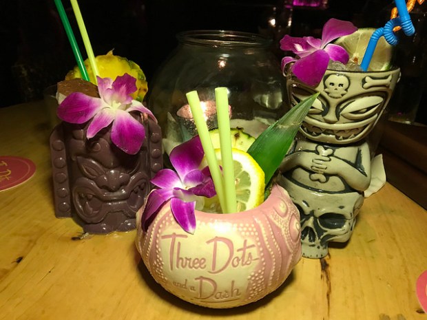 Then we headed back to downtown to check out Three Dots and a Dash. I had gone to Lost Lake the night before and wanted to see the bigger tiki bar in town. The bar’s entrance is in the alley. It’s not a speakeasy per se as you’ll spot it with the door guy and the tiki torches. We didn’t make reservations but luckily it wasn’t too busy.