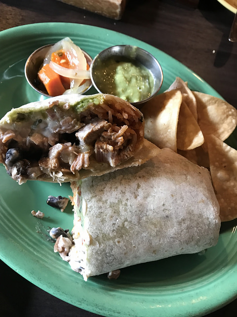 We also got the 7 layer dip (not shown) and a chicken burrito. Happy hour is such an interesting time as I don’t think of it as a real meal and I usually get small snacky things. On this day though, I was very hungry as I had skipped breakfast. I thought a chicken burrito would be a good idea just hours from dinner time. As it turned out, I was stuffed after I ate half the burrito! I ended up digging out the other half and eating it with chips– I don’t know why that seemed lighter. But hey, DIY nachos! The burrito is only $10 and you can make it “wet” for just another $1.