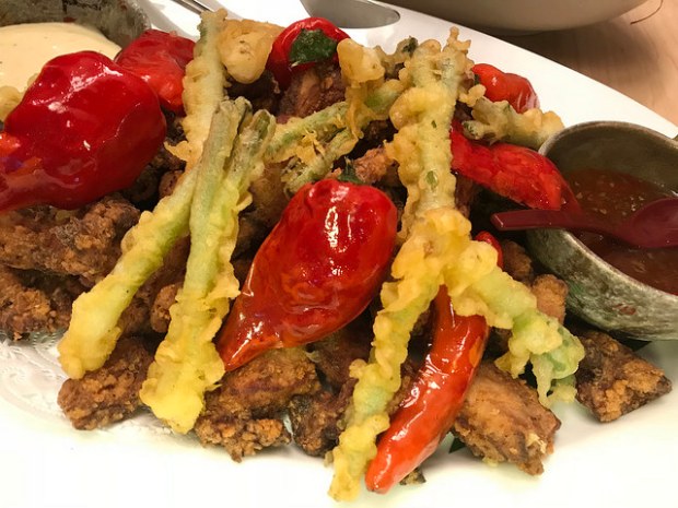 But we actually started with the City Skies, a refreshing drink that worked well with our fried chicken and fried shrimp appetizers.