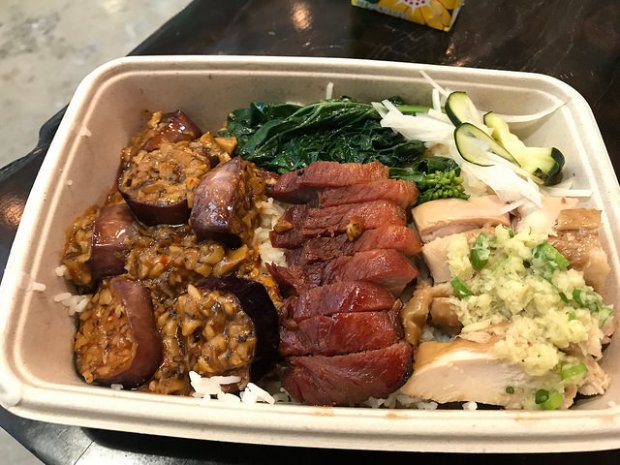 I decided to pick a 3-item combo. I got mapo eggplant which was vegan, char siu and soy sauce chicken. I actually wanted the crispy pork but they were out of it as it was a soft open. I didn’t particularly want the char siu as I always found it too sweet as a kid. It turns out Ricebox’s version was not too sweet and very tender.