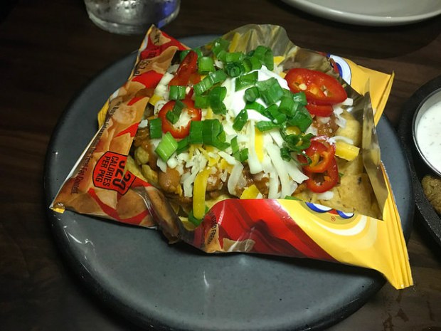 A few years ago, I became obsessed with Frito pie and learned the proper way to serve it. However, we weren’t actually in the stands and opening from the side as shown above makes a better presentation. The chili is surprisingly light. So does that mean I can have two Frito pies? Well, see below– we’re going to fried pickles!