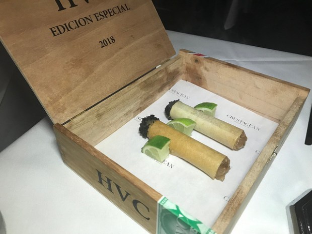 Next, more smoke! The tuna cigars are presented in a cigar box and have caviar studded tips. Really tasty and fun presentation!