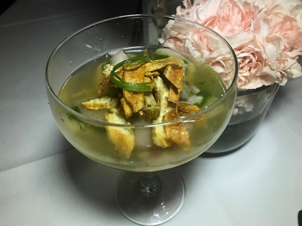I was looking forward to the artichoke yellowtail which turned out to be sashimi with crispy artichoke. The “soup” is poured tableside.