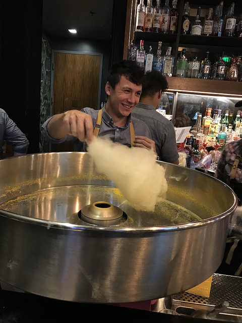 For our first drink, I tried the Bazaar. For those who have gone to the restaurant, Jose Andres is known for his modern cuisine and techniques. There’s a famous drink that gets served with cotton candy. Chris decided to reverse it and inspired by his love of sherry daiquiries, he created a cocktail that uses the sugar of the cotton candy as the sweetening agent in the drink. And yes, he makes the banana flavored cotton candy in house (as shown above).