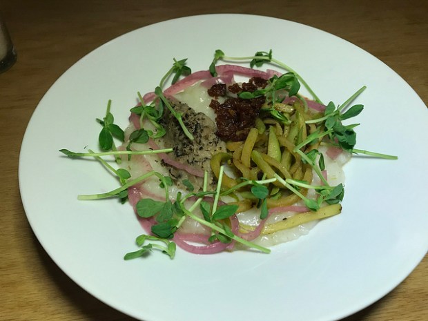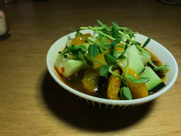 One of the appetizers we had were the cukes and seaweed. I was trying to figure out what type of seaweed this was. I loved the wavy curls so much. I’m a big fan and have made both pickled cucumber (or pickles) and seaweed salad before. I’ll have to remember to try them together and brightened up with a few segments of citrus. It was a light and tasty appetizer.