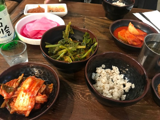 For the five of us, we ordered the chicken noodle soup, bossam (pork wraps), mandu (dumplings), and tteodokki (rice cakes). Before the food came, we loaded up on the banchan. One of the girls showed me how to eat the barley rice which you add in some of the greens including the liquid and the provided sauce — a mixture of super finely diced jalepeno, sesame, red pepper paste and you could consider this the mother sauce.