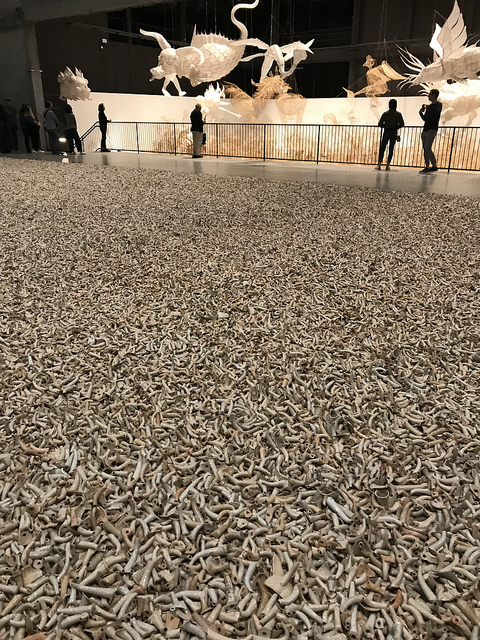 The beauty of his work comes from the enormity of it all. The broken tea pot spouts, the bicycles repeated over and over. Even the individually painted bits to imitate sunflower seeds.