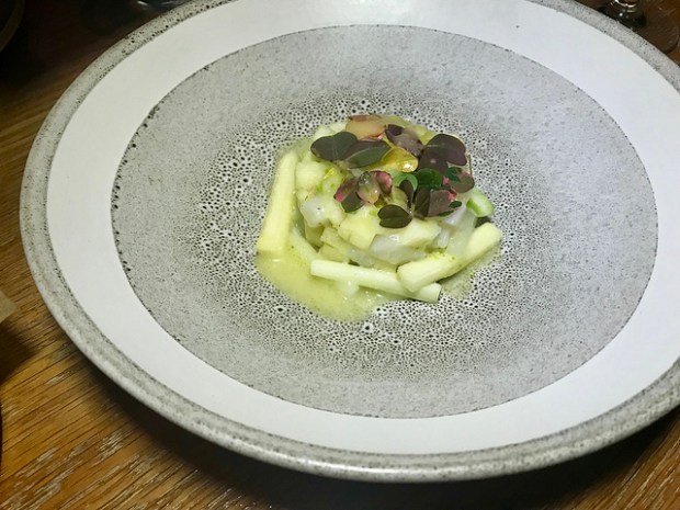 The scallop tartine was served with apples and daikon. When our weather gets warmer (and stays warmer!), this will be a wonderful spring or summer dish.