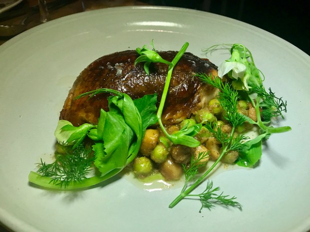 Roasted chicken was served with brioche stuffing, black truffles, English peas, banyule vinegar and dill.
